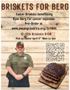 The Fire Department will be hosting this event April 5th. Order a Brisket or make a donation, all proceeds will go to Lt Berg & Family for expenses. For Details go to the following link → Pecan Grove Volunteer Fire Department